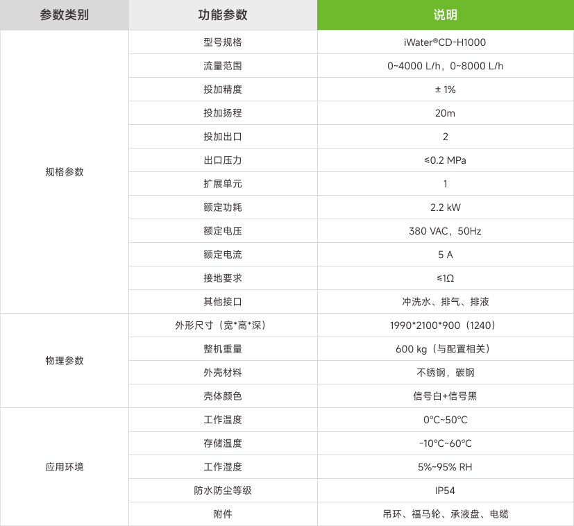 iWater®CD智能安稳投加装备精准型H系列(一体式),设计精美、布局合理,空间紧凑,即装即用,可实现室内小空间、室外无遮挡部署。该套一体式设备投加精度±1 %,可实现加药量的精准控制;投加范围10-2000 L/h,可实现全量程自动调节,是一款宽量程、高精度、高集成度、体积小的药剂投加设备,广泛应用于水厂投加各种药剂。